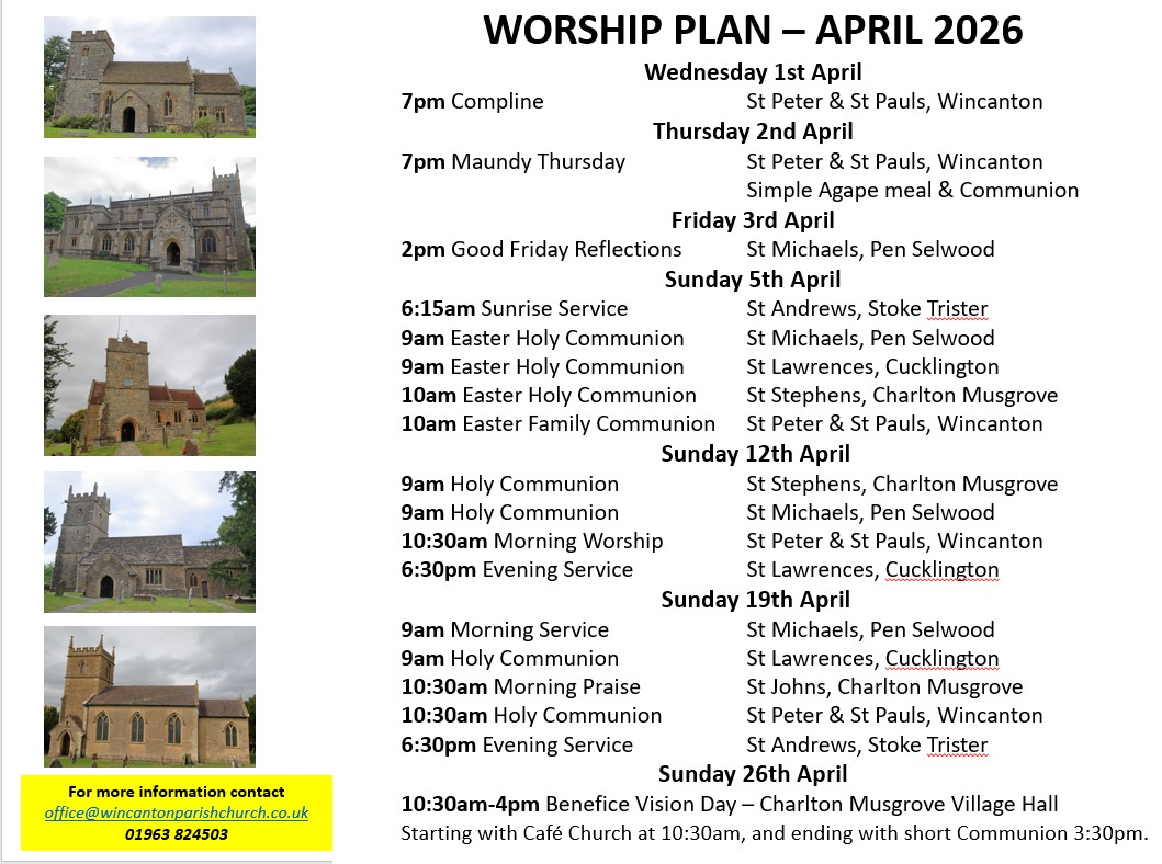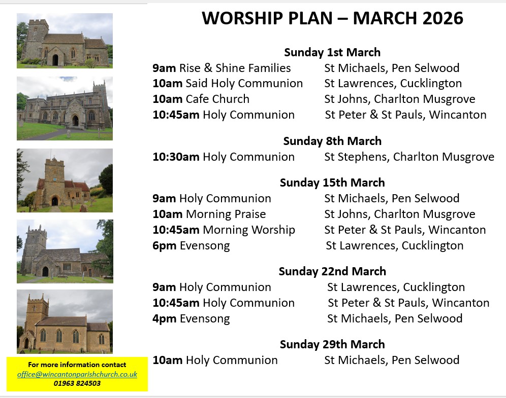 • On Sunday 29th March there will be a Palm Sunday Communion Service including Donkey Procession at St Michael’s Church, Pen Selwood  at 10am. No service in Wincanton Church today.