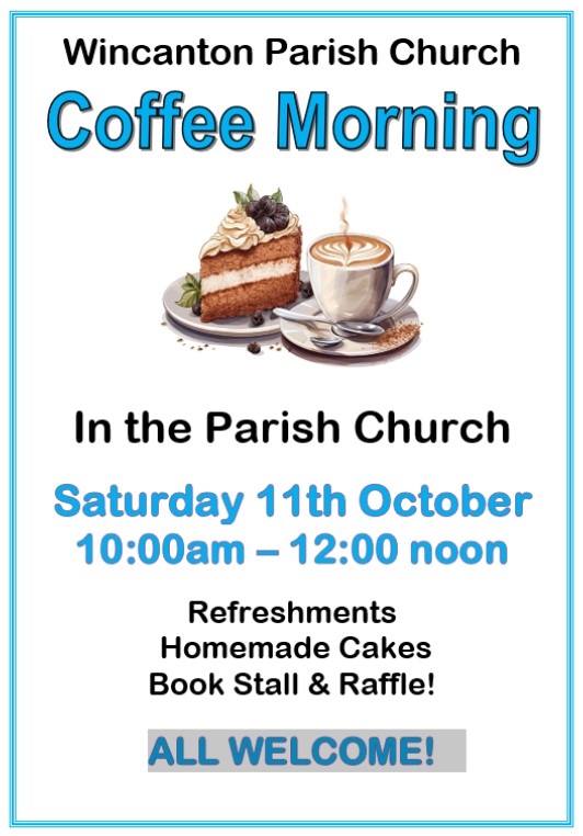 Coffee Morning Saturday 11th October 10.00am – 12:00 noon St Peter & St Paul’s Church Raffle, Homemade Cakes & Savouries, Bookstall & Refreshments! Everybody Welcome! All Coffee Mornings are held in Church 10am – 12:00 noon on the 2nd Saturday of the month.
