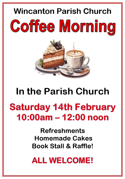 Coffee Morning Saturday 14th February 10.00am – 12:00 noon St Peter & St Paul’s Church Raffle, Homemade Cakes & Savouries, Bookstall & Refreshments! Everybody Welcome! All Coffee Mornings are held in Church 10am – 12:00 noon on the 2nd Saturday of the month.